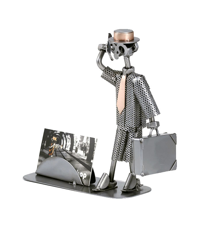 Selvstændig CBS Businessman – Visitkortholder og håndlavet metalfigur 💼👔. Karrieremand med mobiltelefon, rejsetaske eller mappe, hat og slips taler i mobiltelefon og har travlt med at forme karrieren.